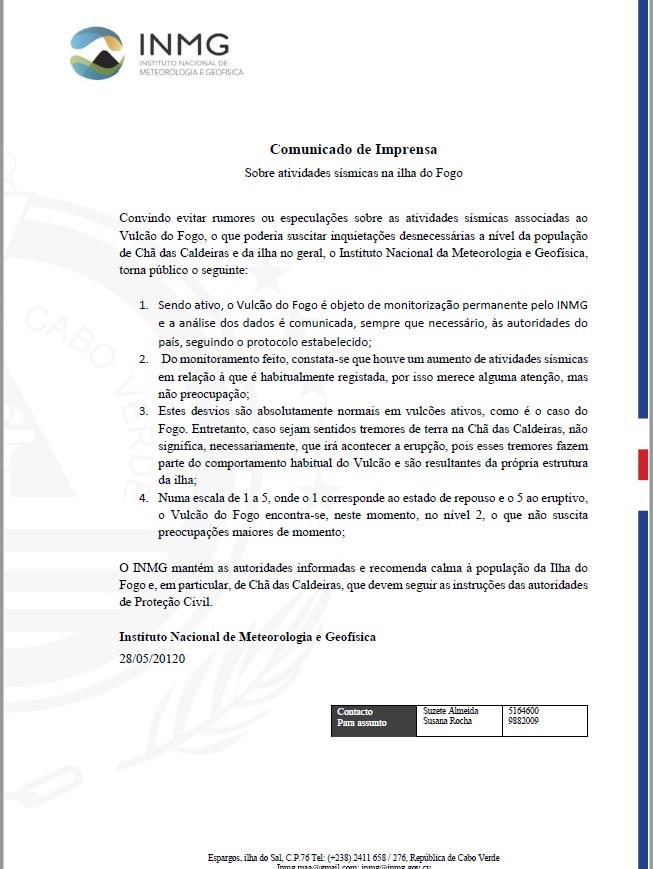 O INMG mantém as autoridades informadas e recomenda calma à população da Ilha do Fogo e, em particular, de Chã das Caldeiras, que devem seguir as instruções das autoridades de Proteção Civil.
